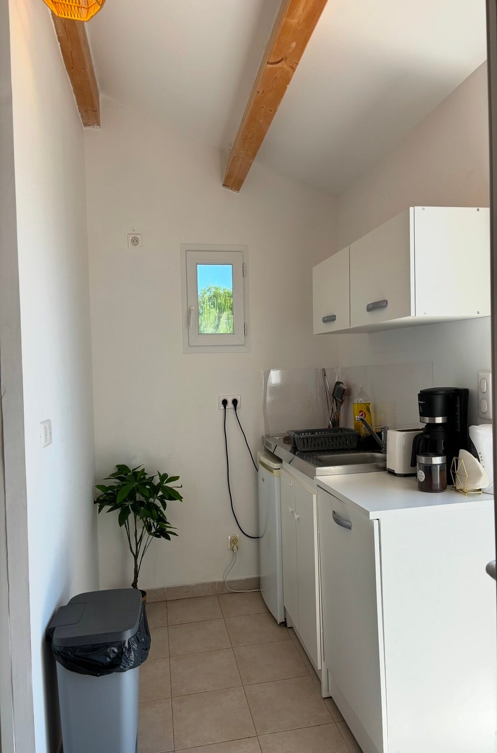 Cuisine équipée ( réfrigérateur, congélateur, plaque de cuisson, grille pain, bouilloire, cafetière ). Espace de vie lumineux et accueillant composé d’un un couchage deux personnes , une télévision et une table de repas.
