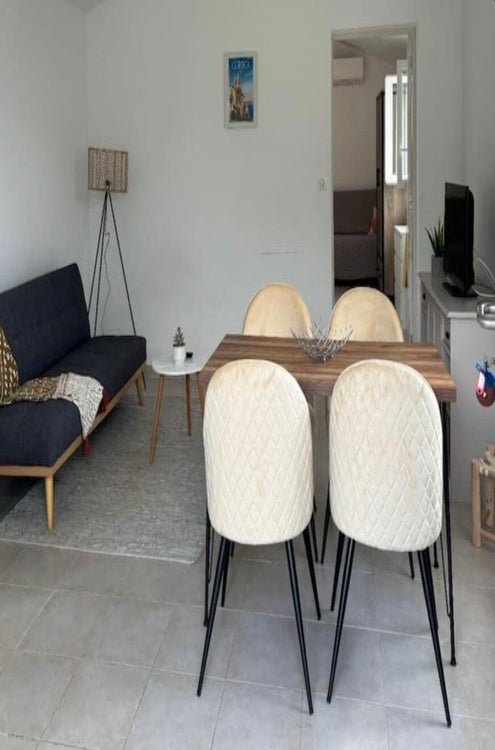 Cuisine équipée ( réfrigérateur, congélateur, plaque de cuisson, grille pain, bouilloire, cafetière ). Espace de vie lumineux et accueillant composé d’un canapé convertible (couchage pour 1 personne) une télévision et une table de repas.